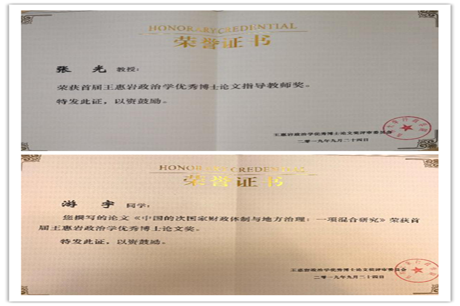(图为张光教授和游宇博士的获奖证书)