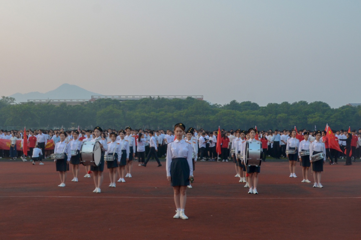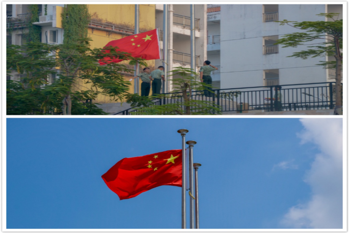 护旗手们迈着铿锵的步伐来到国旗台下,全场一片肃静。在激昂的《义勇军进行曲》中,升旗手振臂一挥,鲜艳的五星红旗徐徐展开,在初升的阳光映照下,师生的注目中,迎着初升的太阳,在晨曦中迎风飘扬。
