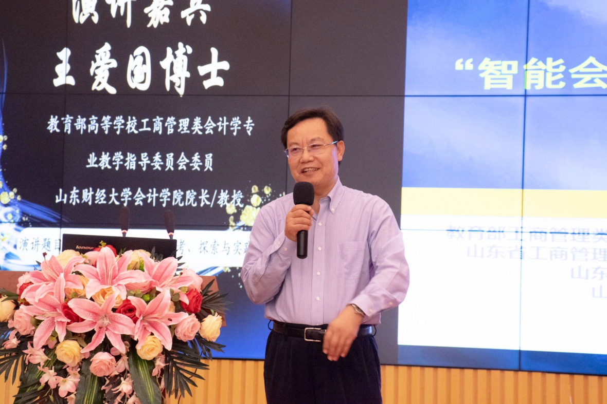 图为教育部高等学校工商管理类会计学专业教学指导委员会委员王爱国教授演讲