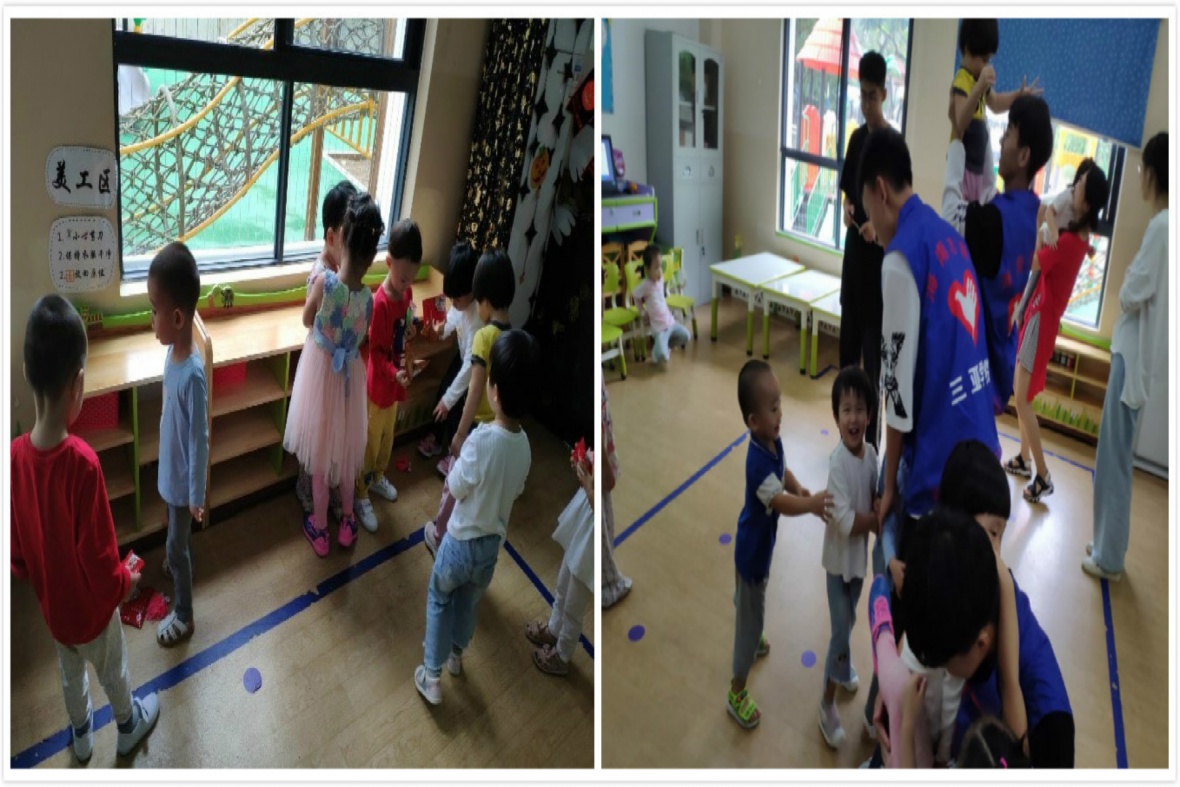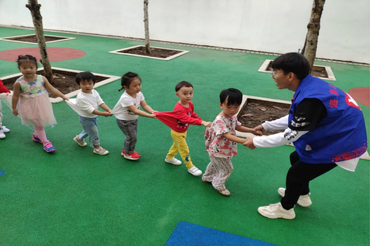 图为志愿者与小朋友们玩开火车小游戏的场景