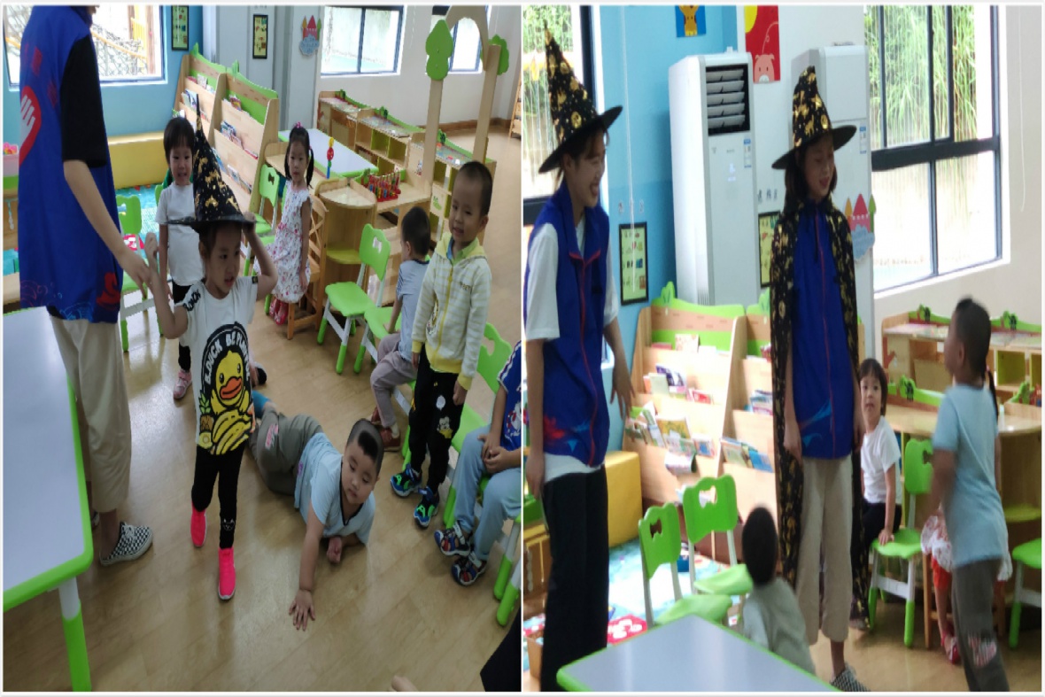 与此同时,志愿者们在芽芽二班举行了另一个活动,万圣变装。志愿者们拿出巫婆套装,与小朋友们玩起了语言游戏,模仿着电视里的剧情讲话,锻炼小朋友的语言能力。小朋友们都融入在这个快乐的活动里。