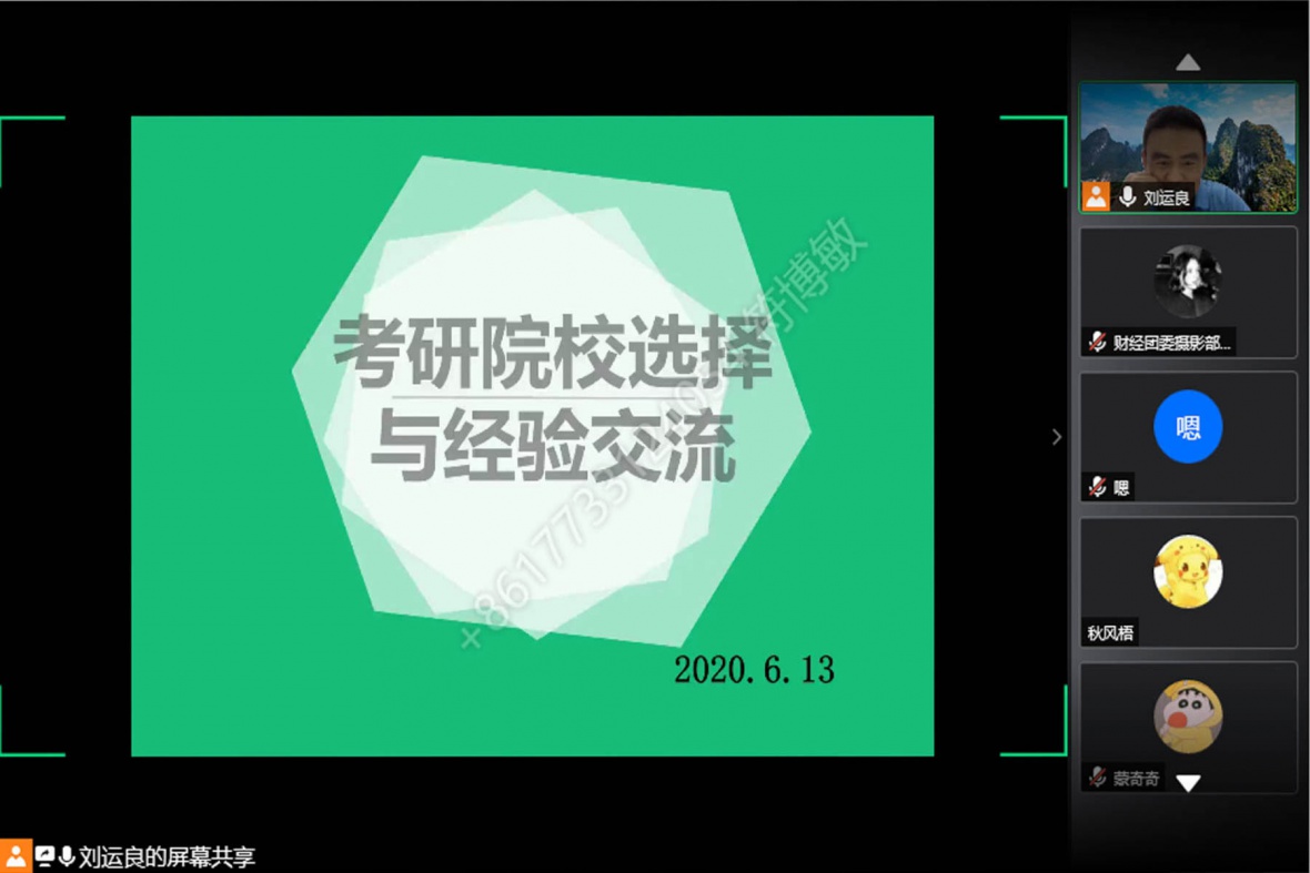 (财经团委 讯)2020年6月13日19:30,必赢集团bwin在腾讯会议开展了一场线上考研备战经验交流会。参加本次会议的人有必赢集团bwin刘运良老师和今年考研成功的两位学姐以及备战考研的同学们。
