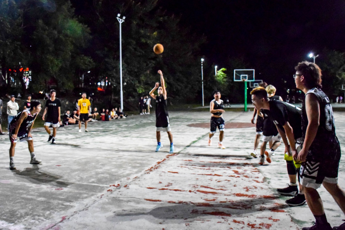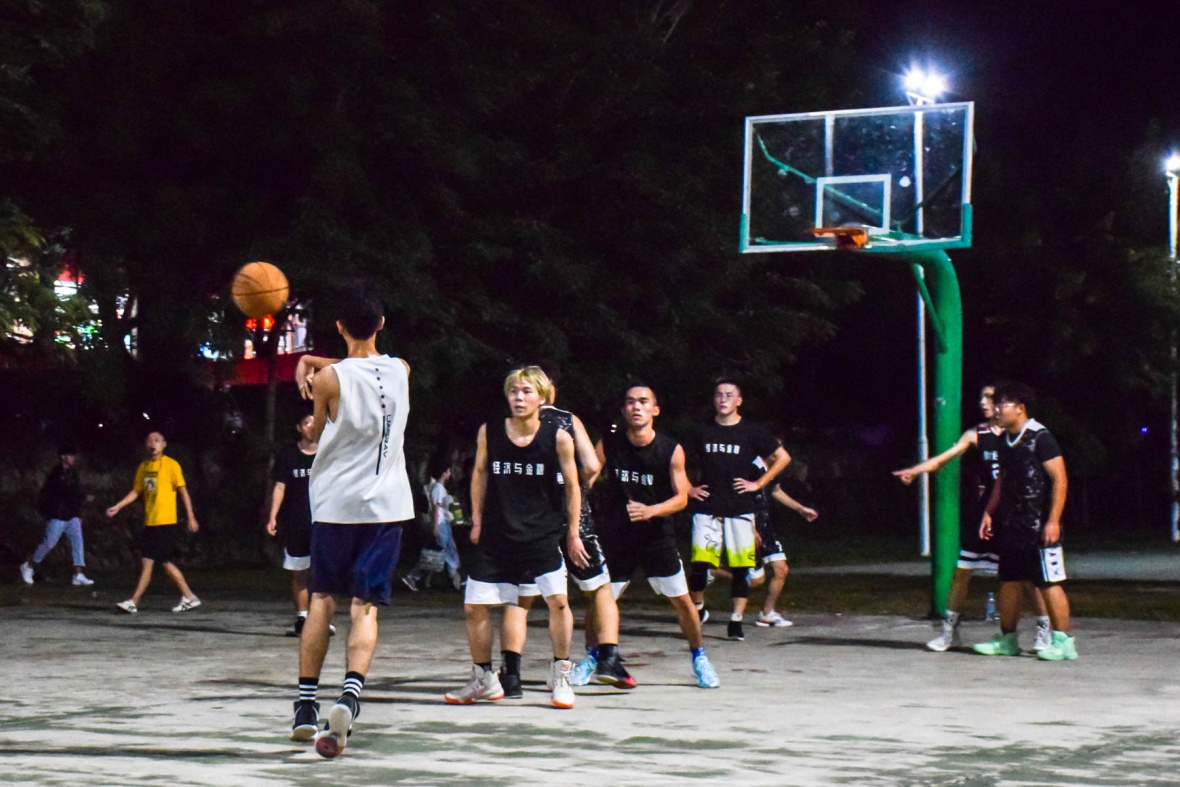 在晚霞消失之时选手们陆续来到球场,各自开始了比赛前的热身运动。比赛即将开始选手们走向选定的位置,裁判来到球场中央,在篮球被抛起的那一刻,比赛开始了。经金班的运动员们首先展开了进攻,但因为操作失误被对方以罚球拿下的第一分。比赛精彩刺激,第一节经金1901班以15:14稍显优势赢得国贸1901班,第二节马上开始,国贸班以微小的差距得到领先,第四节因为经金1901班主力体力不支使得经金1901班节节败退以45:64被国贸1901班拿下的这场比赛的胜利。