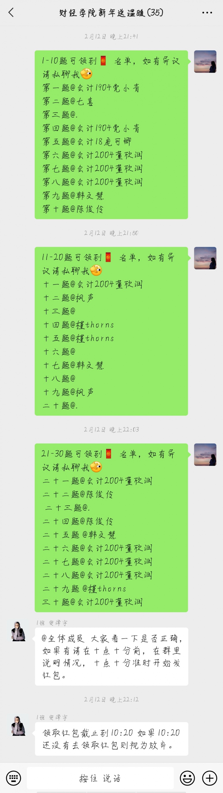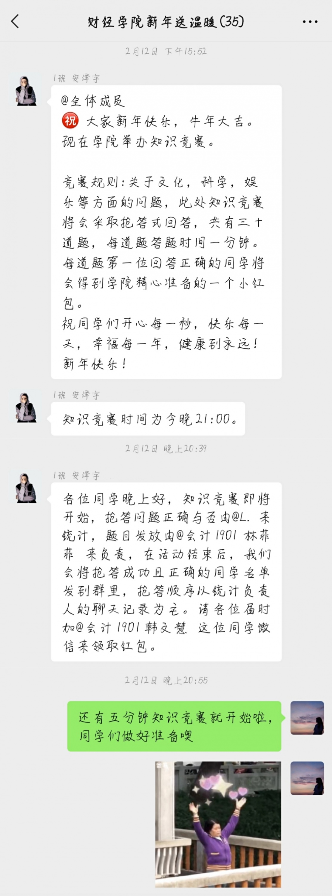 本次的竞赛活动关于文化、科学、娱乐等方面的问题并采取抢答模式,共有三十道题,每道题答题时间为一分钟,在益智添趣,娱乐生活的同时,更以这种传统高雅的文艺形式展现一方水土、民俗之特色与魅力,集趣味性,知识性与一体,让大家学有所乐。最后得分最高的同学还将会获得学院精心准备的一个小红包。21:00整,比赛准时开始,同学们积极抢答,即使是在线上,也能感受到春节喜气洋洋的气氛,主持人还不时地在群里发灯笼小表情与同学们互动,一副其乐融融新年的景象,浓浓的年味在群里流淌着。愉快的时间总是很短暂的,新年知识竞赛很快就结束了,每位参与的同学们都得到了来自必赢集团bwin的专属小红包。
