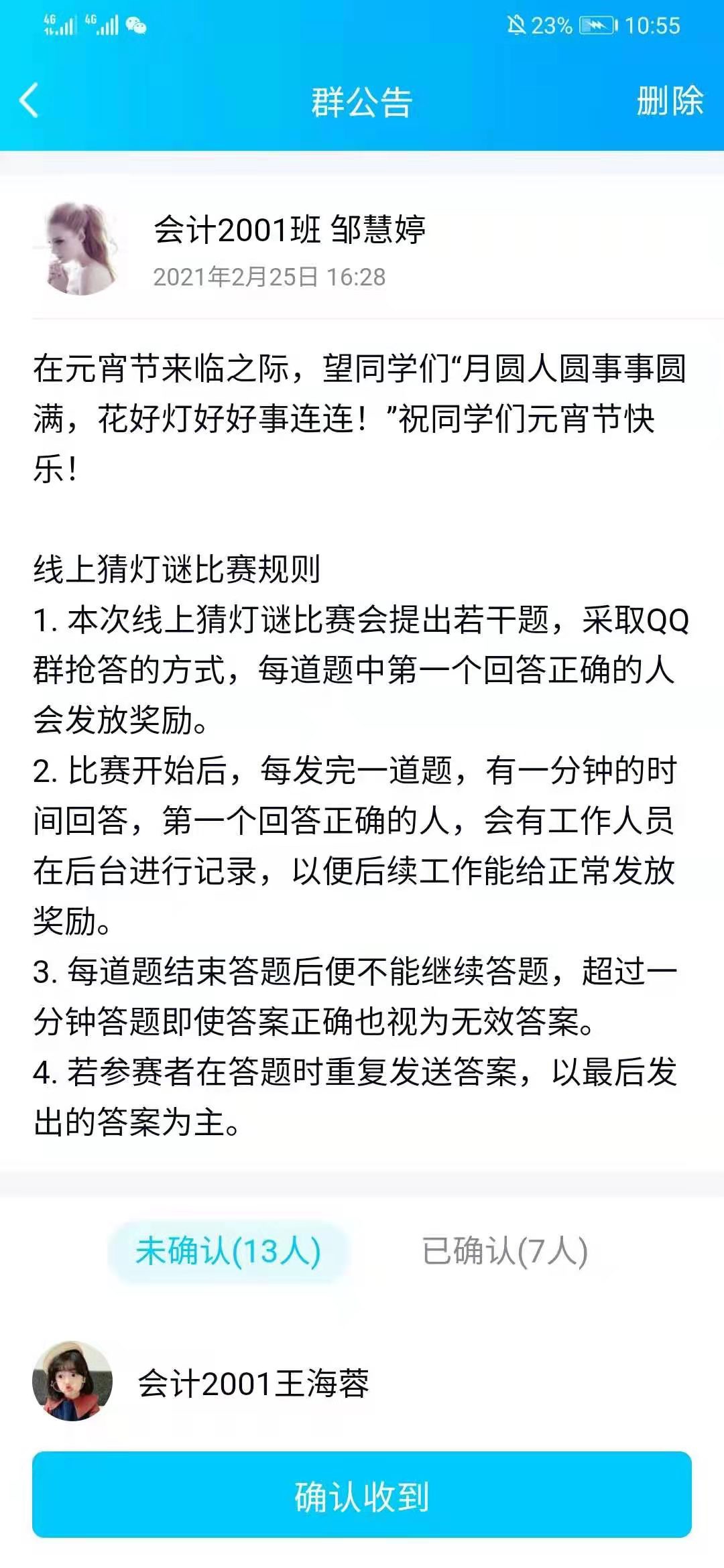 本次线上猜灯谜比赛会将提出若干题,采取QQ群抢答的方式,每道题中第一个回答正确的人会发放奖励,比赛开始后,每发完一道题,有一分钟的时间作答,一人六组灯谜,猜对一个记一分,猜对两个记四分,每答错一个扣两分。第一个回答正确的人将会由后台工作人员记录,以便后续能正常发放奖励。
