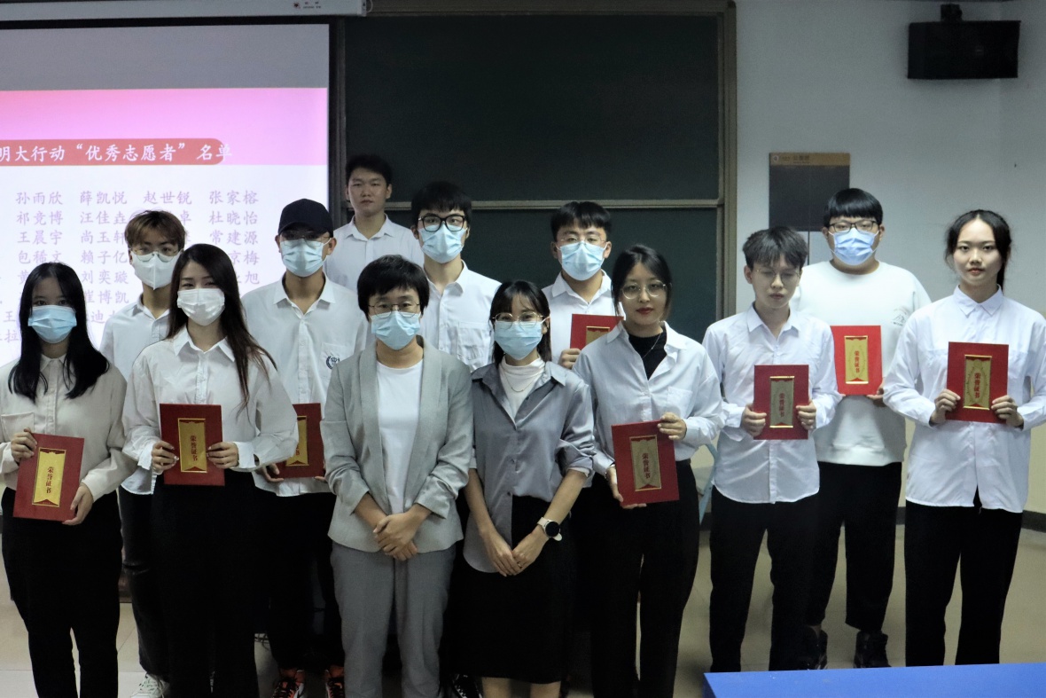 接着,进行颁奖环节。祝弘扬老师和邓倩妮老师和为获奖班级:会计1901班、会计1903班、财管2002班,获奖宿舍:北30-209、北30-207、北28-111、东9-331、东9-537、东9-532宿舍和48名获奖志愿者颁发证书,并合影留念。