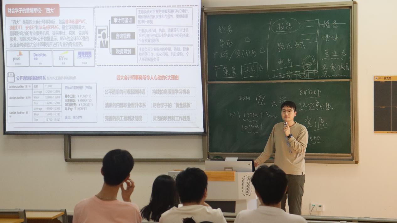 谈及就业,杨老师分享了丰富的职场经验,对比财务、审计、金融机构多岗位需求,为参会学生指明方向,拓宽视野。在大学规划上,杨老师建议大一大二的学生要利用寒暑假投身实习,沉浸式感受职场,积累丰富的实践经验。最后杨老师点明,提前备考不仅有利于提升成绩,更是一把通往名企的“密钥”。