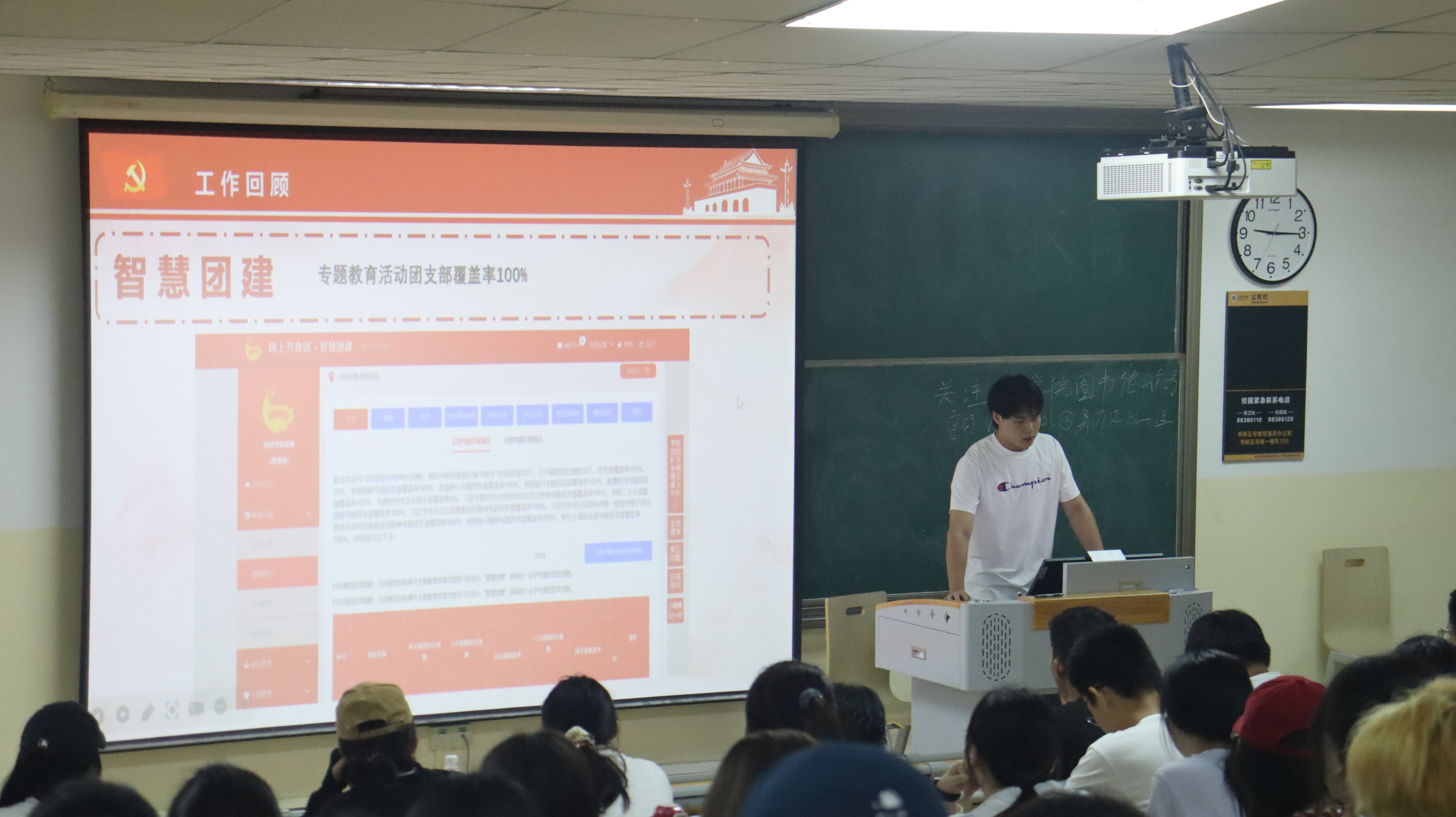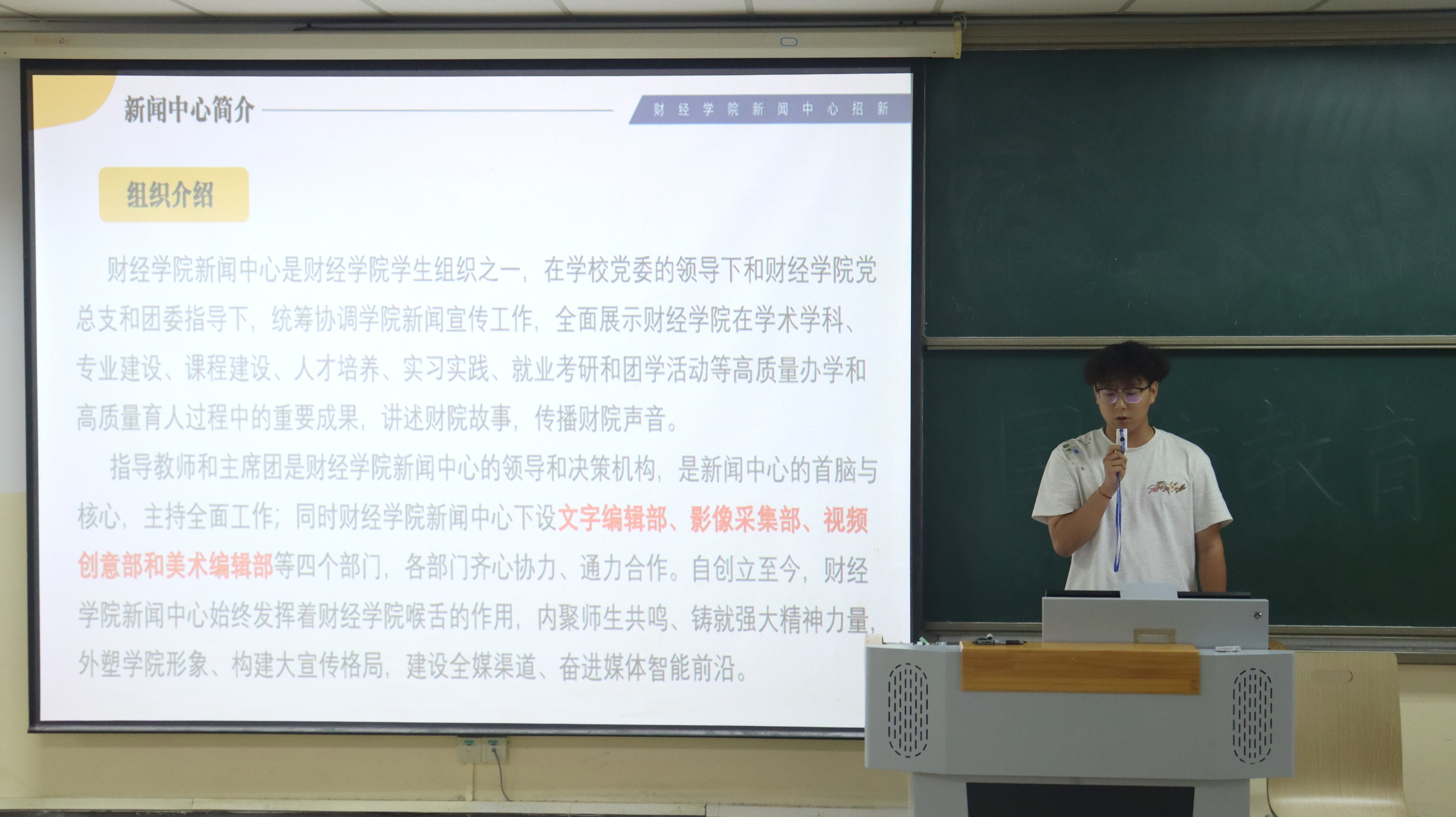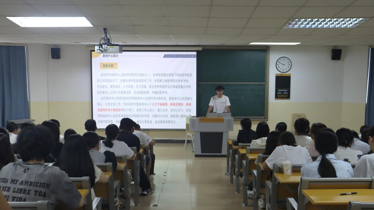 会议伊始,由团委(学)林宇迪、马守明、郭研龙三位同学介绍了团委(学)主要工作内容、工作职能以及纳新要求等方面,并对新生的到来表示欢迎;随后,学生会张博涵、王智涛两位同学介绍了学生会的组成机制、各部门负责人及部门职能,欢迎擅长策划、沟通能力强的新生共同打造多彩校园生活;接下来,新闻中心杨佳霖、胡涵月、陈淇三位同学介绍了新闻中心的组织架构及特色活动,通过文图展示和视频展播等方式全面介绍了新闻中心各个部门,引发新生的浓厚兴趣。